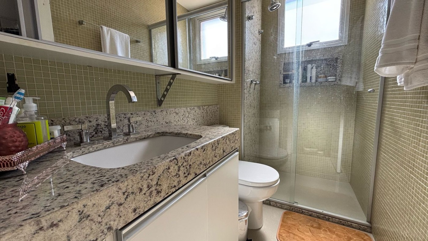No interior, a atmosfera elegante é realçada pelo acabamento de qualidade. O living amplo abre-se para a varanda, onde o espaço gourmet com bancada em granito e ponto de gás se torna palco de momentos inesquecíveis. A suíte principal, com closet e banheiro com armários planejados, reflete o cuidado em oferecer privacidade e bem-estar.