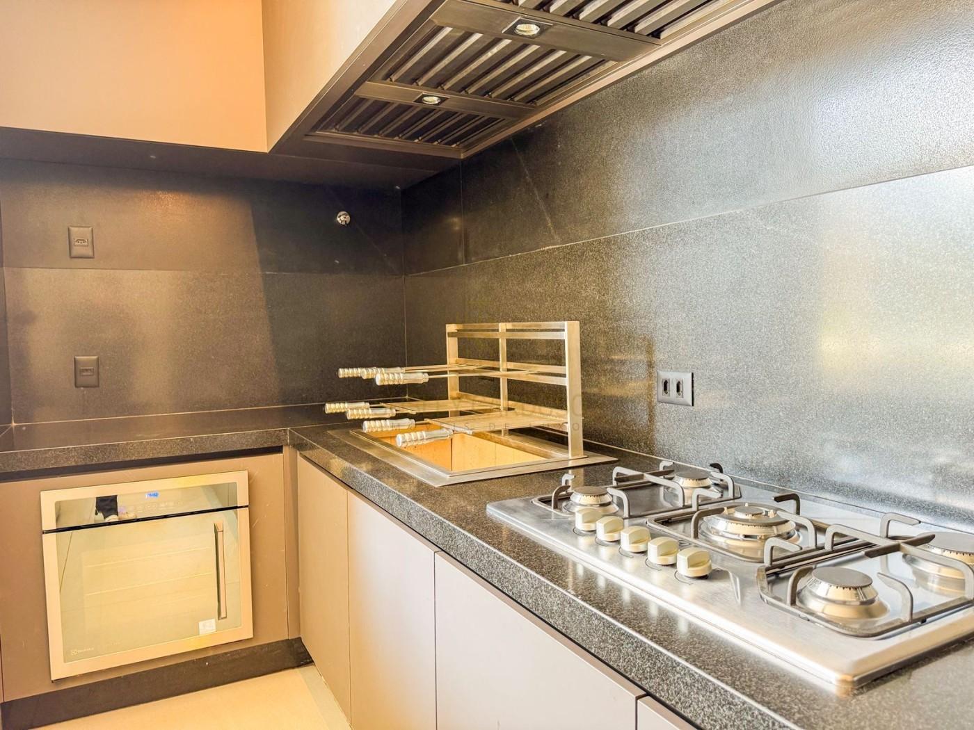 A cozinha é funcional e moderna com bancada em granito preto.