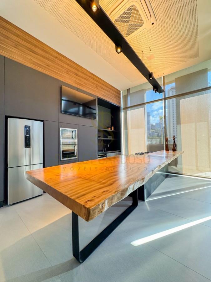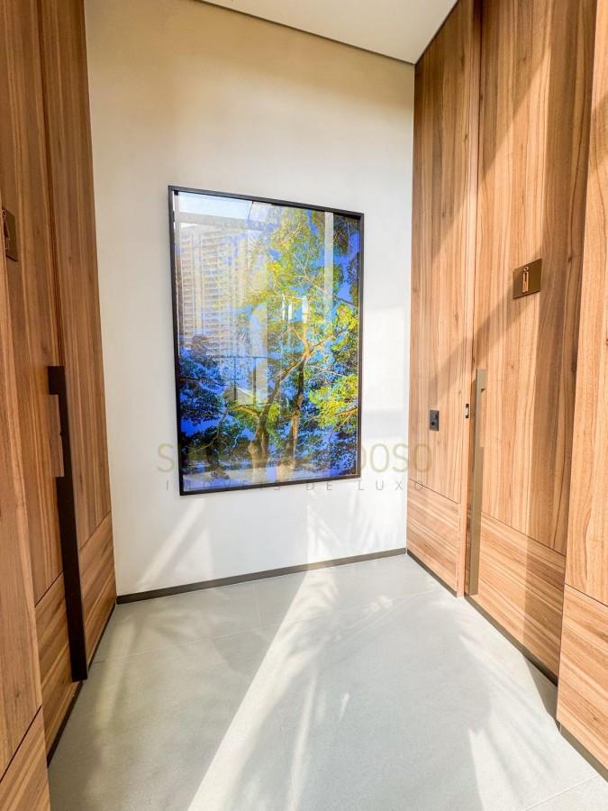 Este apartamento de 142m², possui uma sala ampla se conecta à varanda, criando um ambiente elegante para receber.