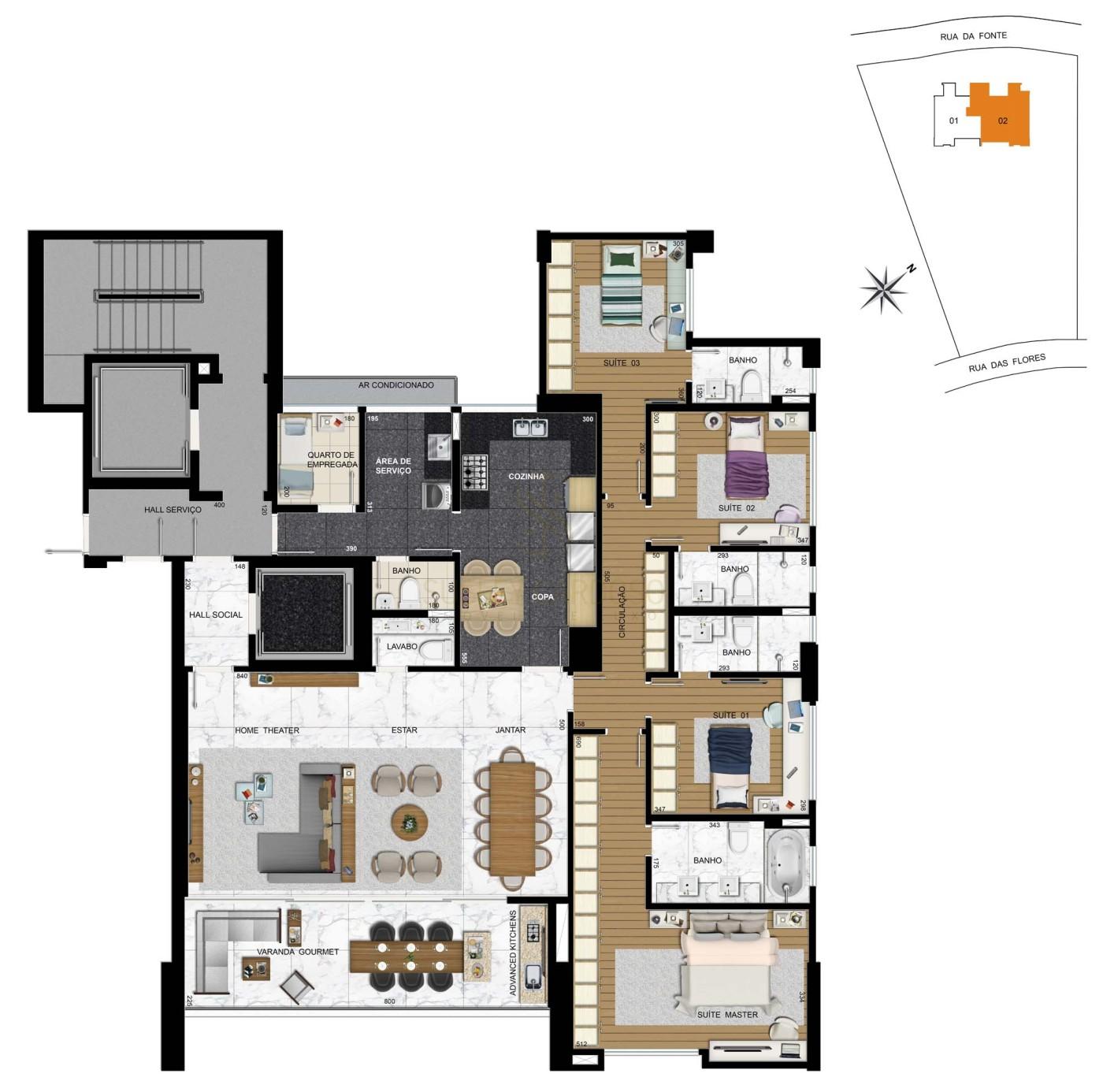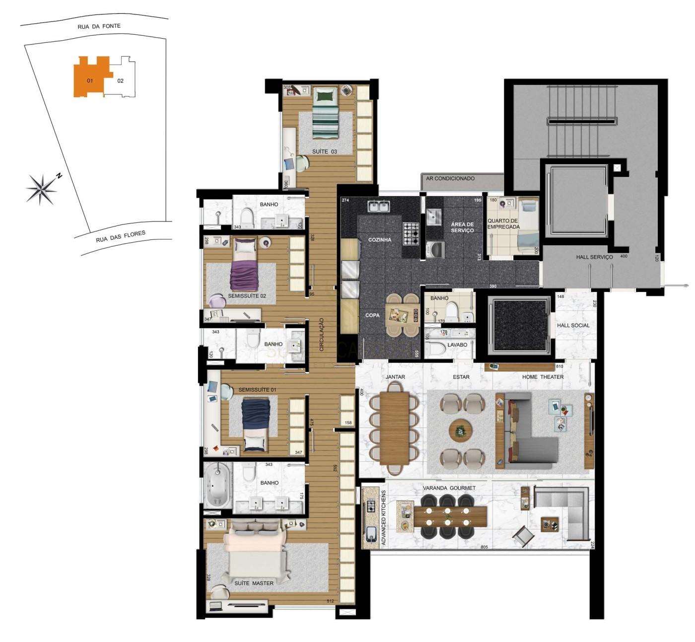 O imóvel possui 4 quartos, sendo 2 suítes e 2 semi-suítes, além de lavabo, dependência completa de empregada e 4 vagas de garagem, com box individual. A sala ampla e bem iluminada integra-se à varanda gourmet, criando um ambiente perfeito para receber amigos e familiares com elegância e praticidade. A cozinha, moderna e funcional, foi planejada para oferecer integração e conforto no dia a dia.