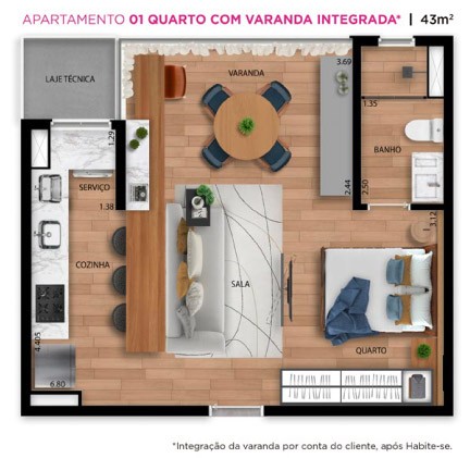 O apartamento de 1 quartos possui cozinha americana e varanda.